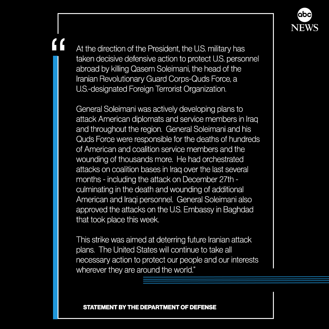 BREAKING: Qassem Soleimani, the leader of Iran's elite Quds Force, reportedly killed in airstrike that targeted a convoy near the airport in Baghdad.https://abcn.ws/2MR27p9