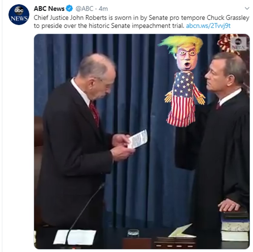 I'm sure he'll put on a good show... Chief Justice John Roberts is sworn in by Senate pro tempore Chuck Grassley to preside over the historic Senate impeachment trial. https://abcn.ws/2Tvvj9t pic.twitter.com/JittxbXgib