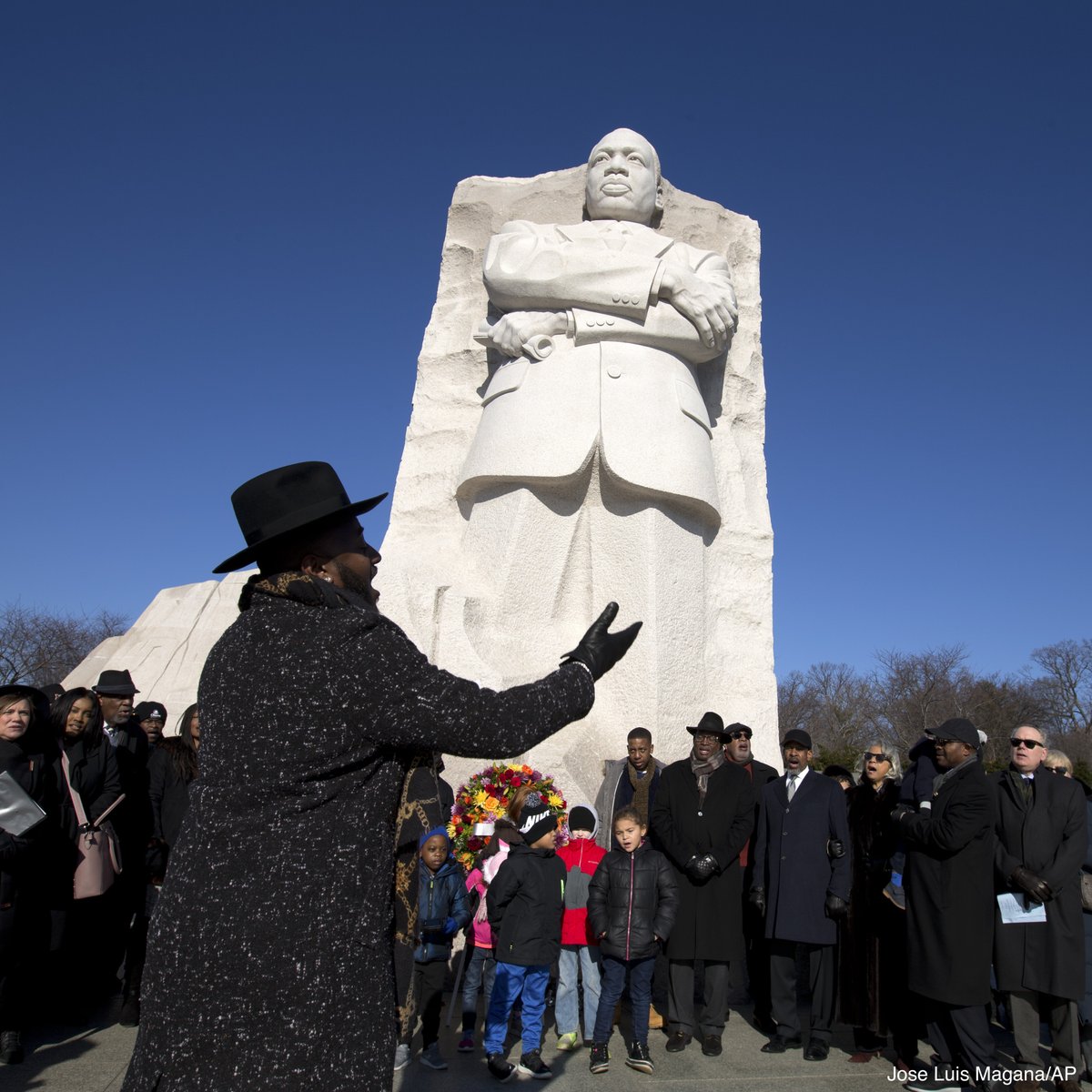 Clifton Ross directs a choir at the Martin Luther King, Jr. memorial, during the Wreath Laying and Day of Reflection and Reconciliation, in Washington, D.C. https://abcn.ws/2RvVgTA pic.twitter.com/5kPdvW29Gw