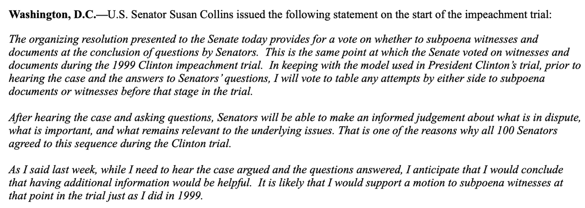 Sen. Susan Collins: "Prior to hearing the case and the answers to Senators’ questions, I will vote to table any attempts by either side to subpoena documents or witnesses before that stage in the trial." https://abcn.ws/2GcSxJq pic.twitter.com/WyHZemgJLo