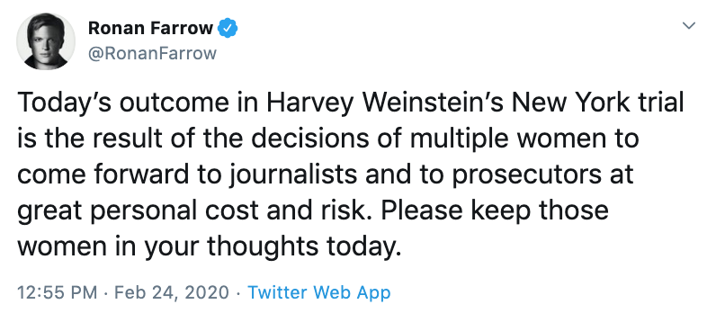 NEW: Ronan Farrow: "Today’s outcome...is the result of the decisions of multiple women to come forward to journalists and to prosecutors at great personal cost and risk. Please keep those women in your thoughts today." http://abcn.ws/2VhTiK3 pic.twitter.com/NlFyALKcHt