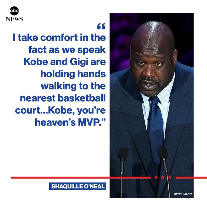 Shaquille O'Neal pays tribute to friend and former teammate Kobe Bryant: "I take comfort in the fact as we speak Kobe and Gigi are holding hands walking to the nearest basketball court…Kobe, you’re heaven’s MVP." https://abcn.ws/2uwTRVu pic.twitter.com/JJ7zR7huJq