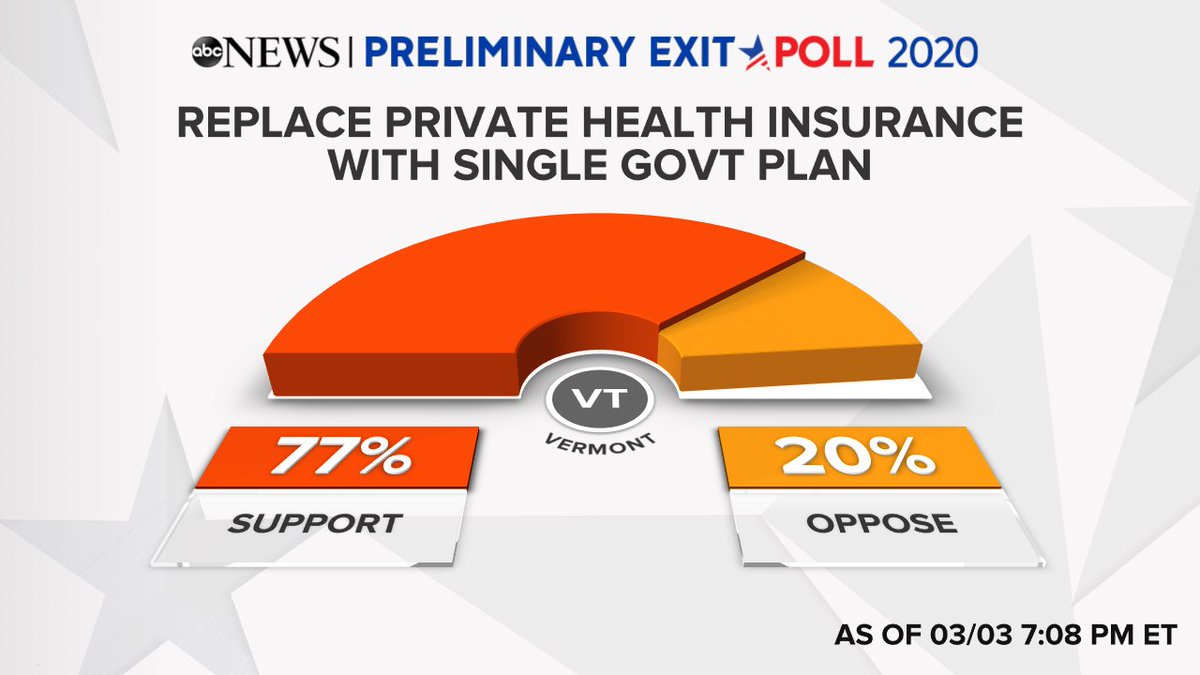 NEW: 77% of voters in Vermont's Democratic primary were in favor of replacing all private health insurance with a single government plan, the most in states with exit polls today or in any previous stated. https://abcn.ws/2PIfqJU  #SuperTuesdaypic.twitter.com/aXd2CFWY9W