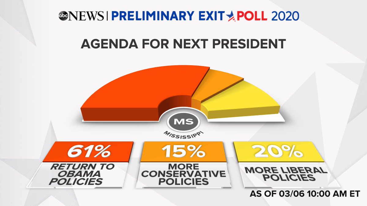 NEW: 61% of voters in the Mississippi Democratic primary say they’d like to see the next president return to Obama administration's policies, per preliminary exit poll results—the most in any state so far this year for which we have exit polls. https://abcn.ws/3aKTTbw pic.twitter.com/0HJMAb5qlG