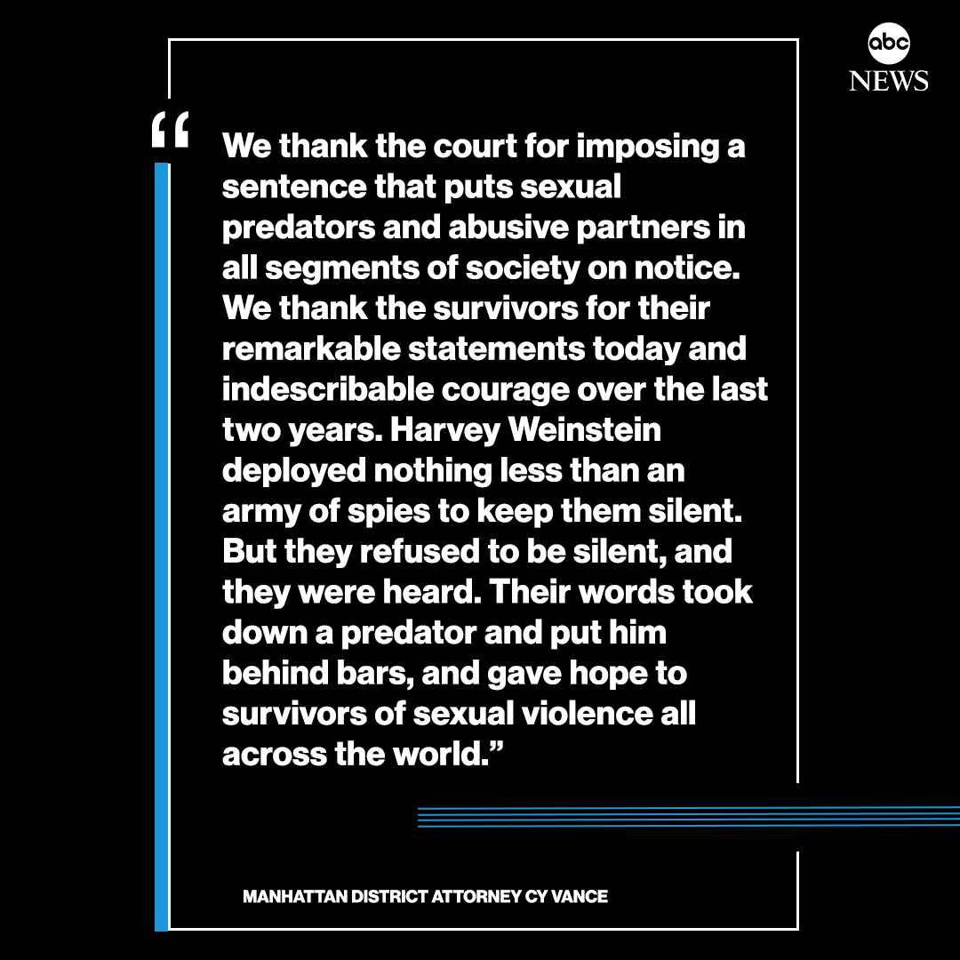 NEW: Manhattan District Attorney Cy Vance on Harvey Weinstein's sentencing: "We thank the court for imposing a sentence that puts sexual predators and abusive partners in all segments of society on notice." https://abcn.ws/2xuzFVi pic.twitter.com/X9479XoEVB