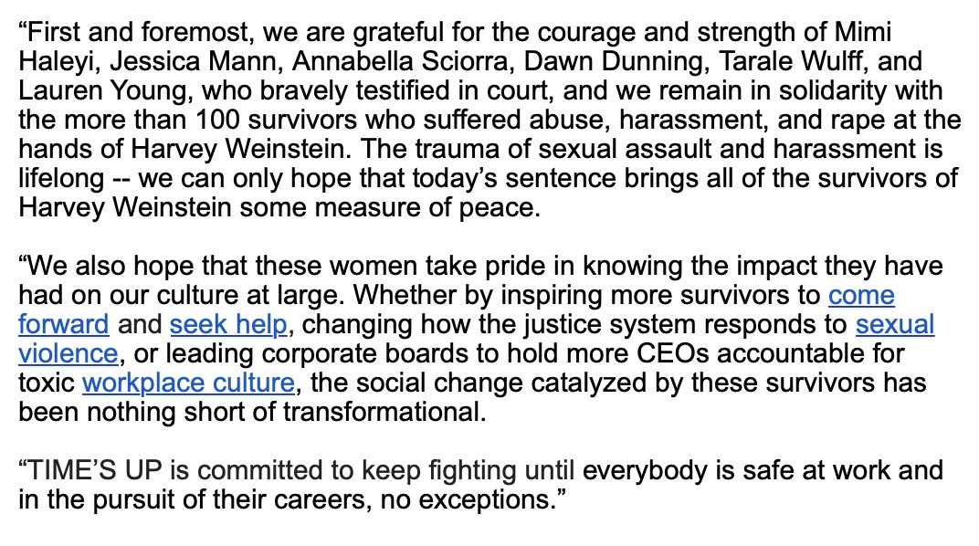 NEW: Statement from TIME'S UP leader: "The trauma of sexual assault and harassment is lifelong—we can only hope that today’s sentence brings all of the survivors of Harvey Weinstein some measure of peace." http://abcn.ws/2xuzFVi pic.twitter.com/VQJjD3WrWZ