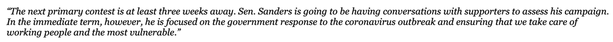 MORE: "In the immediate term, however, he is focused on the government response to the coronavirus outbreak and ensuring that we take care of working people and the most vulnerable," campaign spokesperson says. http://abcn.ws/391sgtJ pic.twitter.com/zMNgEDa7lT
