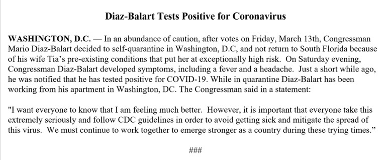 NEW: Rep. Mario Díaz-Balart says he has tested positive for coronavirus, becoming the first congressman to do so.https://abcn.ws/2U3aMJ7
