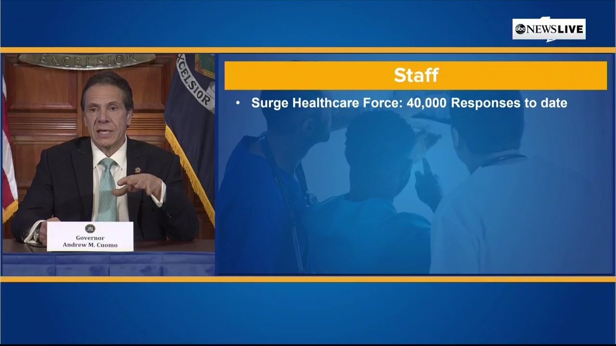 "God bless them." NY Gov. Andrew Cuomo says there have been 40,000 people have responded to request for "surge health care force," including physicians, nurse practitioners and more. https://abcn.ws/39hnicu pic.twitter.com/Gk22FstSTG