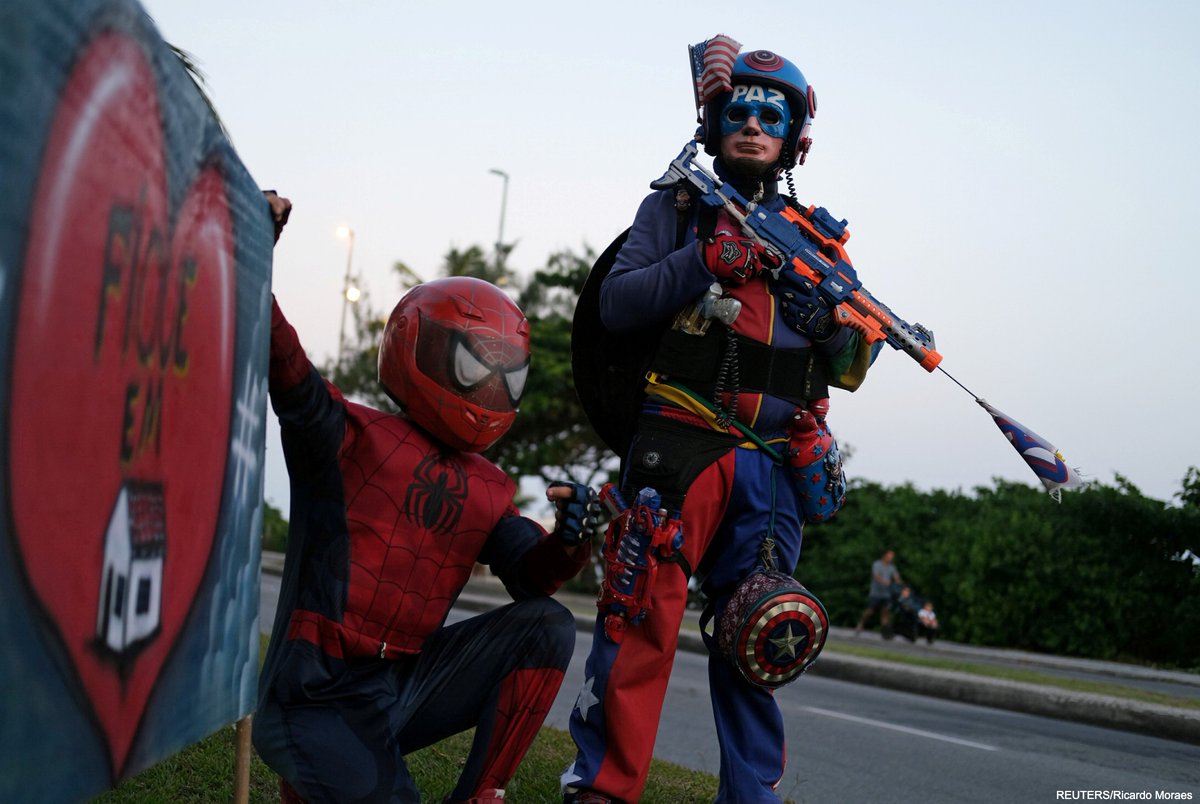SPIDEY SAYS STAY HOME: Men dressed up as superheroes stand with a banner reading "Stay at Home" in Barra da Tijuca, during the coronavirus outbreak, in Rio de Janeiro, Brazil.
