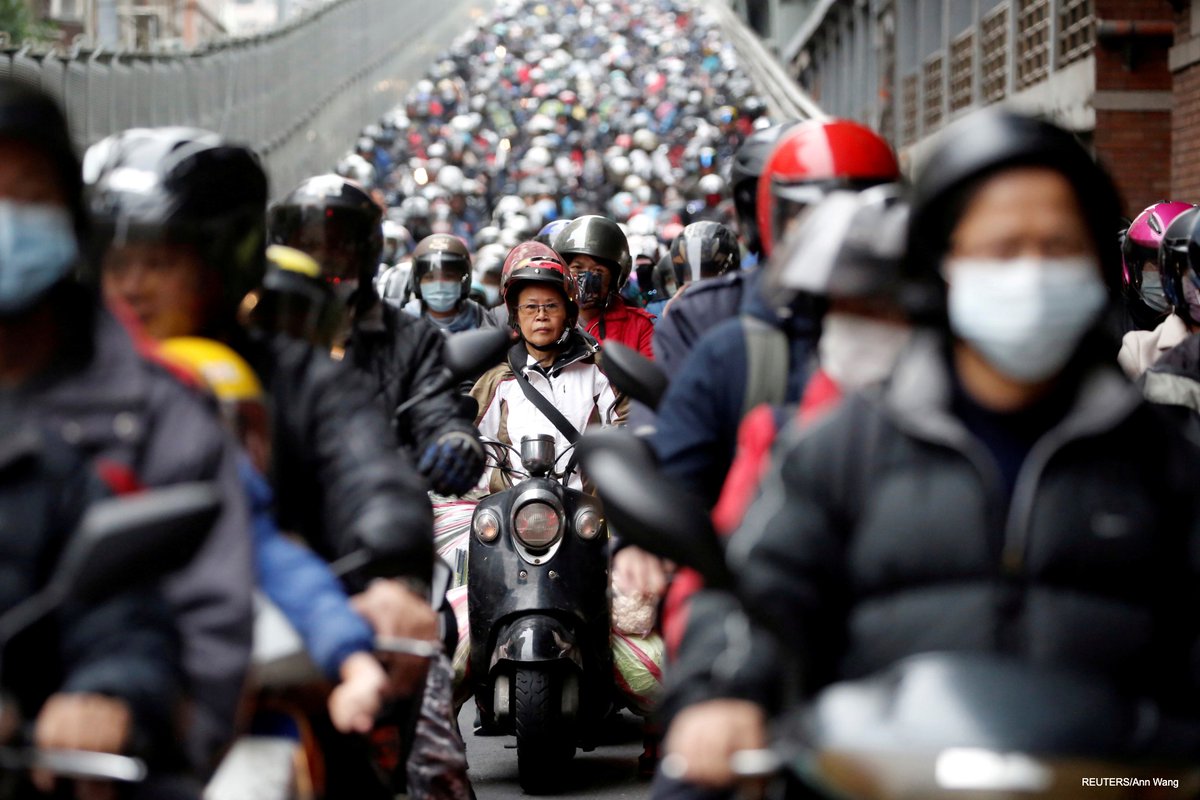 Commuters wear face masks to protect themselves from the coronavirus during morning rush hour traffic in Taipei, Taiwan.