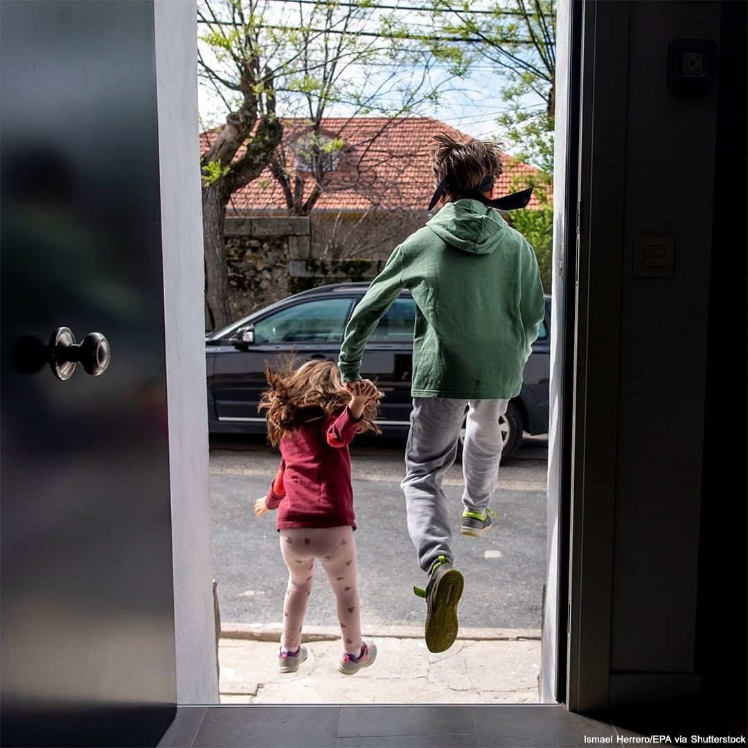 Siblings leap out the front door as children in Spain were allowed outside Sunday for the first time since the country's lockdown began more than 40 days ago.