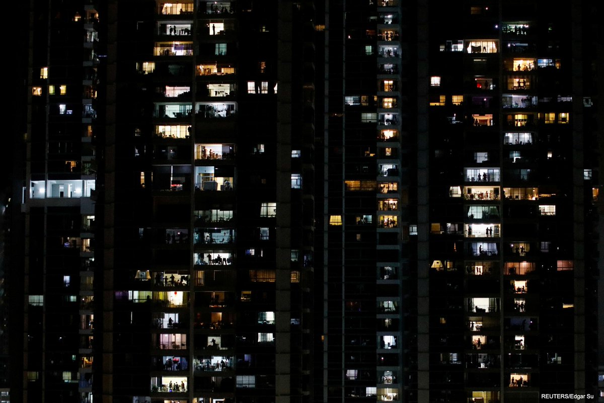 Residents gather at their balconies to sing in tribute to healthcare workers and migrant workers during the coronavirus outbreak in Singapore.