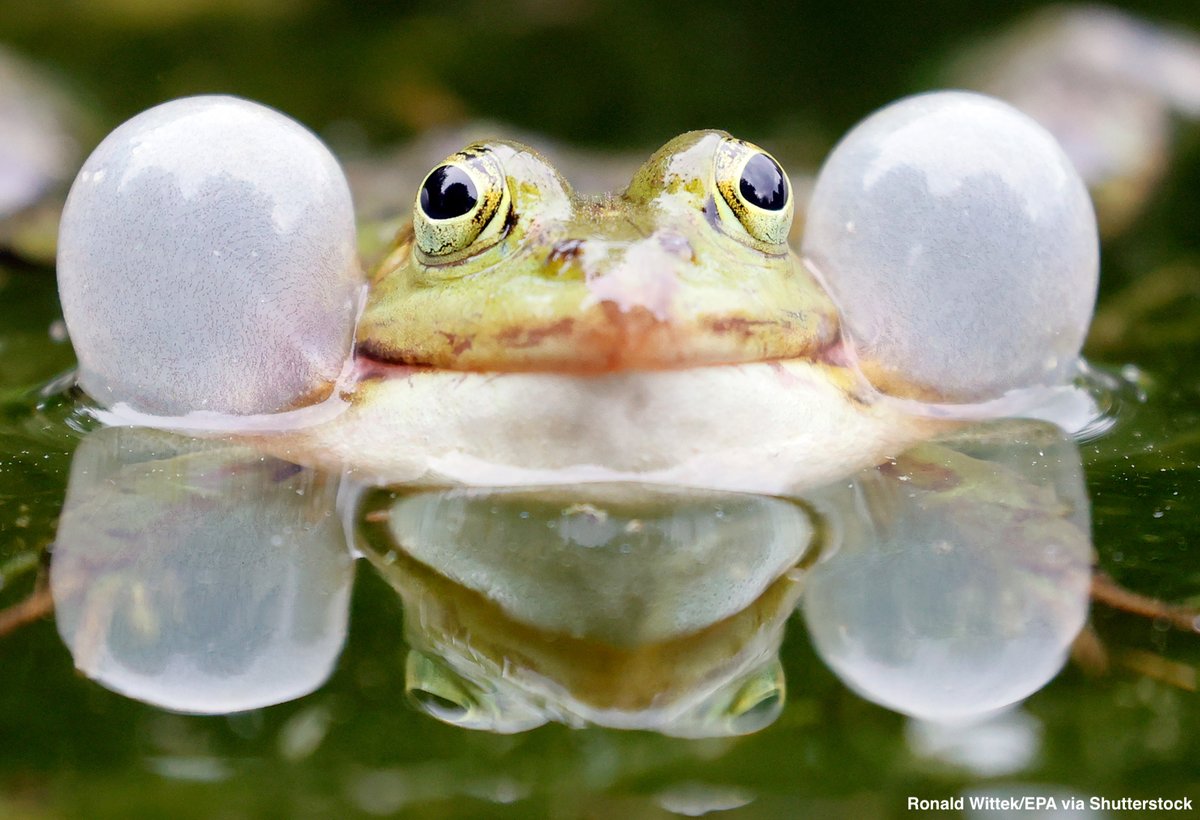 A water frog swims with his sound bubble in a pond at the botanical garden in Heidelberg, Germany. https://abcn.ws/3bM1mYY pic.twitter.com/rJm4gze38X