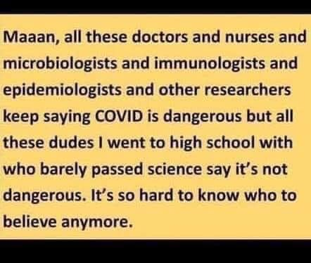 "social media misinformation" is not limited to Social Media. I rarely, if ever, hear anything that helps us to affirm our immune systems. But you are ok to spout the 'wear a mask everywhere you go', breathing in your own carbon dioxide all the time. When do we get real?