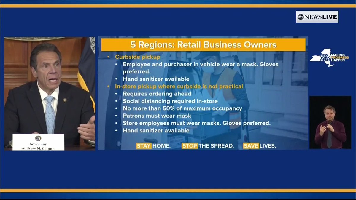 In North Country, Mohawk Valley, Central New York, Finger Lakes and Southern Tier, retail can reopen for curbside pickup. Employees and patrons must wear masks, New York Gov. Cuomo said, and gloves are preferred. https://abcn.ws/2z3k547 pic.twitter.com/QwRdwxwP2f