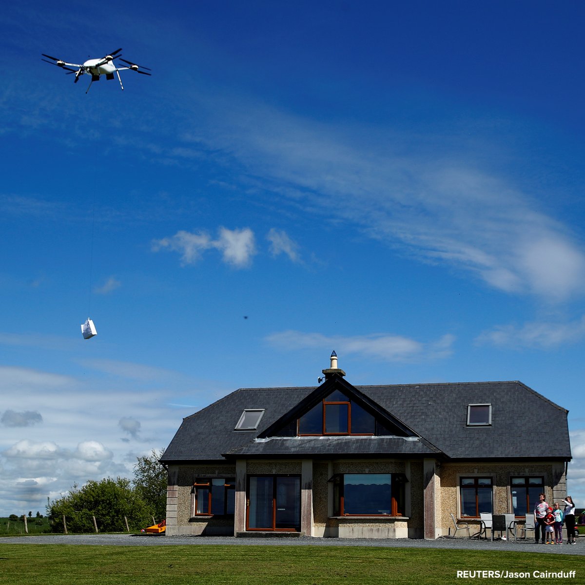 : Residents receive a drone home delivery of essential household and medical supplies in the village of Moneygall, Ireland.