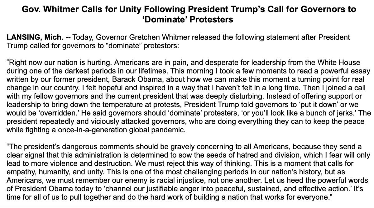 NEW: Michigan Gov. Whitmer says call with Pres. Trump was "deeply disturbing," adding his comments "send a clear signal that this administration is determined to sow the seeds of hatred and division, which I fear will only lead to more violence." http://abcn.ws/36XiHg0 pic.twitter.com/P5j4Kopq8X