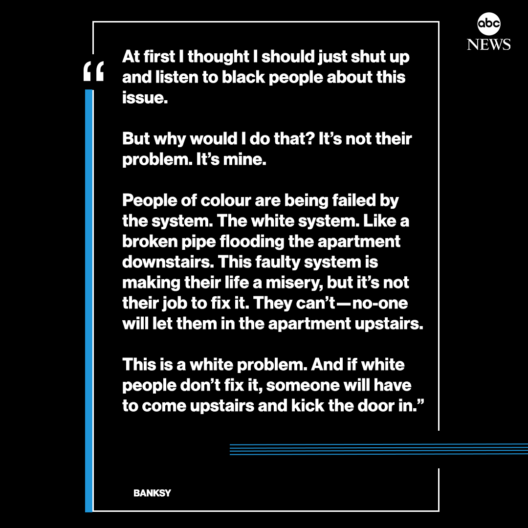 MORE: British street artist Banksy urges action in statement released with new artwork: "People of colour are being failed by the system. The white system...This faulty system is making their life a misery, but it’s not their job to fix it." http://abcn.ws/375uZTs pic.twitter.com/9wdgZUSqJL