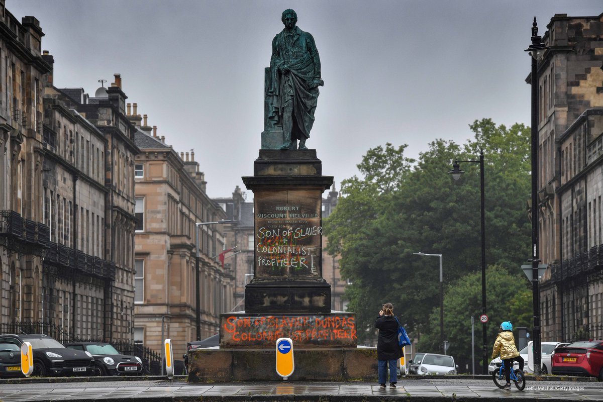 The statue of Robert Dundas is seen in Edinburgh, Scotland after it had been graffitied with 'son of slavery' and 'colonialist profiteer'. Activists have renewed calls to remove statues that honour historical figures with links to the slave trade.