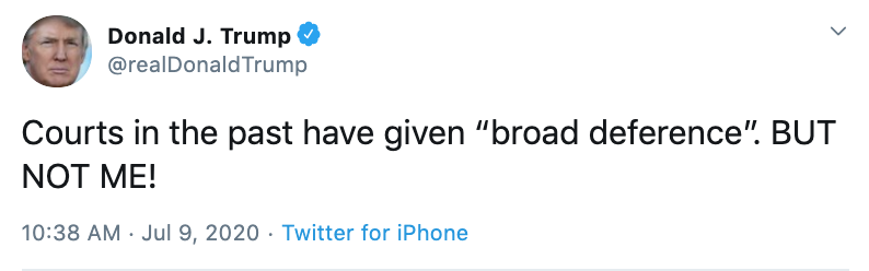 JUST IN: "Courts in the past have given 'broad deference'. BUT NOT ME!" Pres. Trump tweets after Supreme Court rules against him on financial records subpoena in New York criminal investigation. https://abcn.ws/2BWfJNv pic.twitter.com/xO13ixqQcH