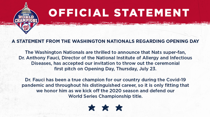NEW: Dr. Anthony Fauci to throw out ceremonial first pitch for the Washington Nationals on Opening Day. In a statement, the team calls him a "true champion for our country." http://abcn.ws/3jxFNjc pic.twitter.com/AKIb4mwMiu