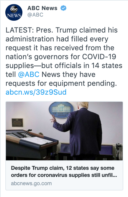 NEW: Pres. Trump claimed his administration had filled every request it has received from the nation’s governors for COVID-19 supplies—but officials in 12 states tell @ABC News they have requests for equipment pending.https://abcn.ws/3fUjQsp