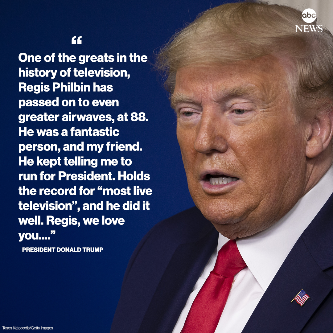 JUST IN: Pres. Trump on Regis Philbin: "He was a fantastic person, and my friend. He kept telling me to run for President. Holds the record for “most live television”, and he did it well. Regis, we love you...." http://abcn.ws/2ZZhAub pic.twitter.com/TIfbq6TjXN