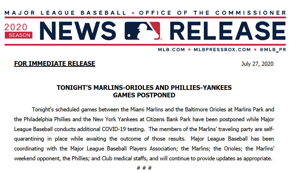 NEW: Phillies-Yankees game also postponed "while Major League Baseball conducts additional COVID-19 testing," league says. http://abcn.ws/39wP85Y pic.twitter.com/TZOKzgQGIB