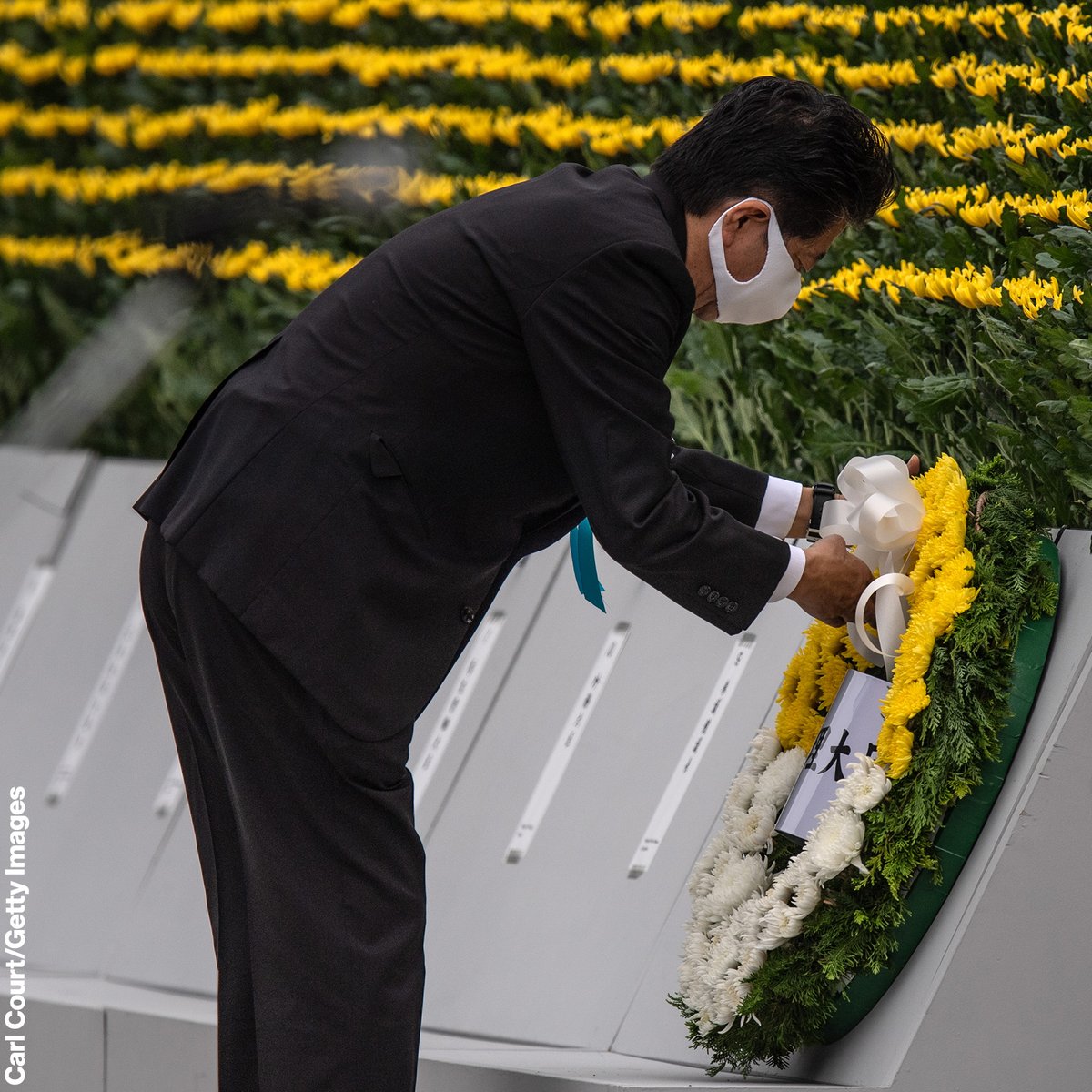 Japanese Prime Minister Shinzo Abe lays a wreath during a ceremony marking 75 years since the 1945 atomic bombing of Hiroshima.