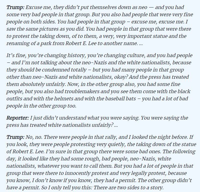 we all saw it! the whole lot of them were white supermacist lol. it was a white supremacist sponsored event. Trump thinks Americans are stupid and that we can’t read in between the lines.