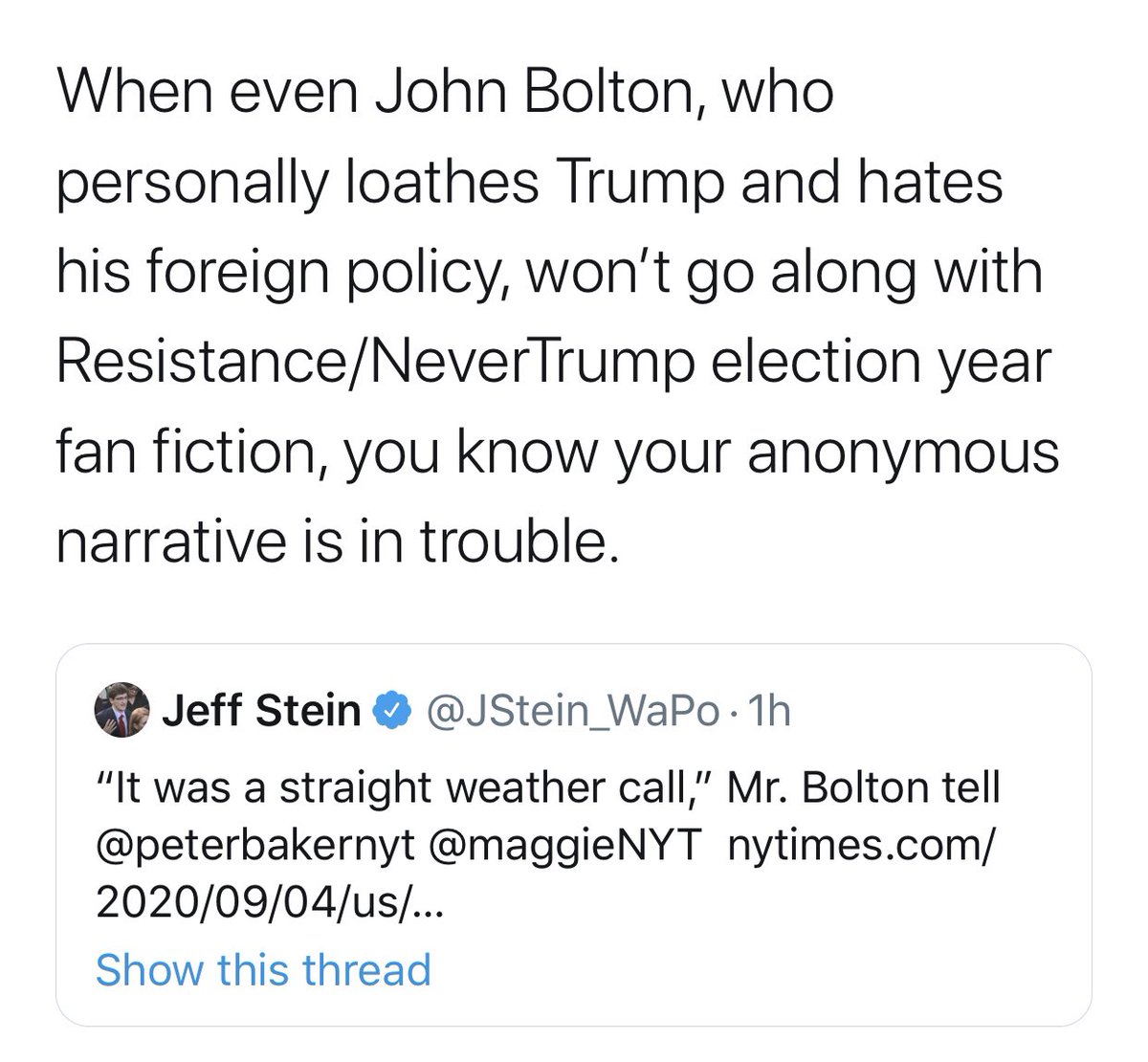 Let me say I don’t like Trump. But if Bolton is disputing the statement who has an ax to grind then that’s significant.