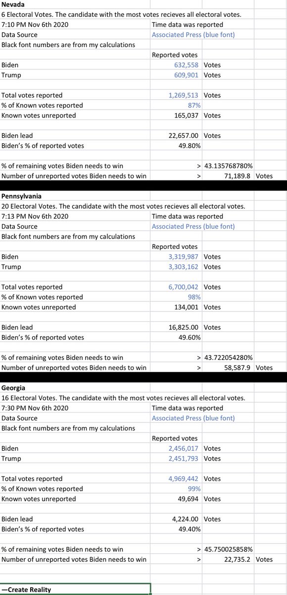 Biden: NV: Received 49.8% of votes. If he receives > 43.14% of remaining votes, gets 6 EC votes. PA: Received 49.6% of votes. If he receives > 43.73% of remaining votes, gets 20 EC votes. GA: Received 49.4% of votes. If he receives > 45.76% of remaining votes, gets 16 EC votes.pic.twitter.com/mQkd3QsKoU