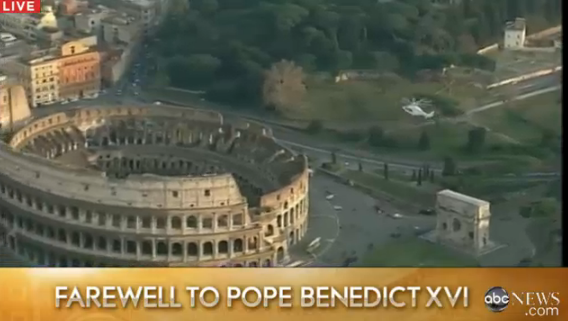 @ABC: The#Pope's helicopter flies over the Roman Colosseum. From#ABCNews live coverage: http://abcn.ws/live pic.twitter.com/ORcGpjBCcm”