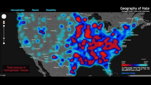 RT @ABC "Geography of Hate" on Twitter maps "racist," "homophobic tweets" http://abcn.ws/YMCTta pic.twitter.com/EOtv0Se6Cc