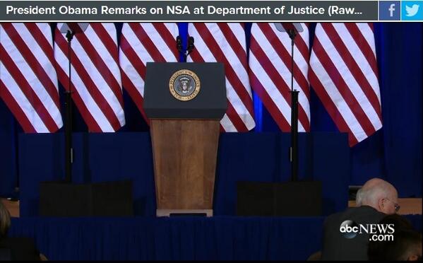 RT “@ABC: LIVE: Pres Obama expected to announce changes to #NSA data collection at 11 a.m ET: http://abcnews.go.com/live pic.twitter.com/2OFkYJmJOD”