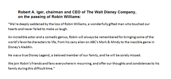 @ABC: Robert A. Iger, chairman and CEO of The Walt Disney Company, on the passing of Robin Williams: pic.twitter.com/j2Hi5jspAZ”#fb