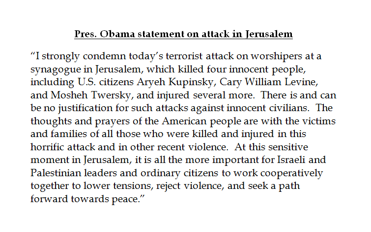 @ABC: JUST IN: Pres. Obama: “I strongly condemn today’s terrorist attack on worshipers at a synagogue in Jerusalem" wow that'll scare them!Thanks. Twitter will use this to make your timeline better. UndoUndo
