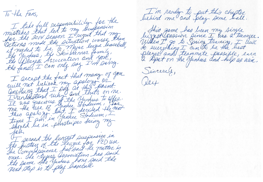 Alex Rodriguez issues formal apology in handwritten letter: http://abcn.ws/1FYgo7N pic.twitter.com/mCxUMVbWhA @ABC RT