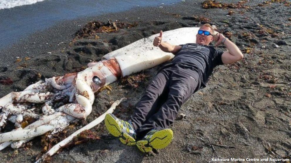 Man RT @ABC: Massive squid with 16-feet-long tentacles washes up on New Zealand beach: http://abcn.ws/1IAJCyc pic.twitter.com/jb0QGJTZfl