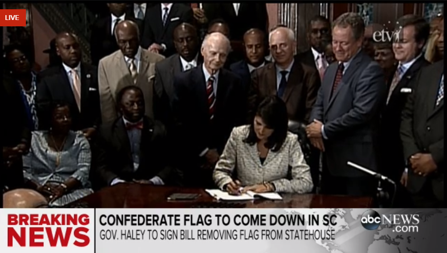 @ABC: JUST IN: South Carolina Gov. Haley signs bill ordering removal of Confederate flag from Statehouse grounds. pic.twitter.com/I4gCFijzp9”