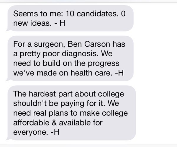 @ABC Who is she texting that she has to sign -H at the end? Reliable source? Also, she gets all of her good ideas from Bernie Sanders.Thanks. Twitter will use this to make your timeline better. UndoUndo