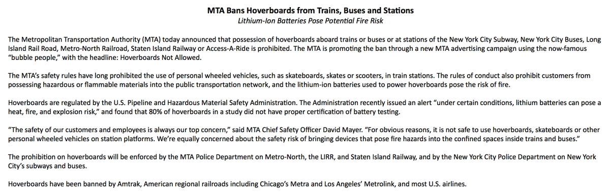 NEW: MTA bans hoverboards from trains, buses and stations due to concern about the safety risk of "fire hazards."pic.twitter.com/D80DnNKmkg