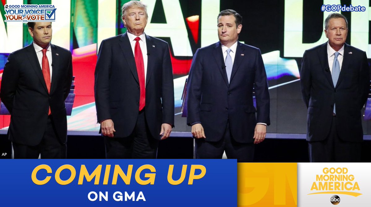 AND ON @GMA: Another day, another debate. Trump, Rubio, Cruz and Kasich square off in next #GOPdebate.pic.twitter.com/CTgpXmxQxf