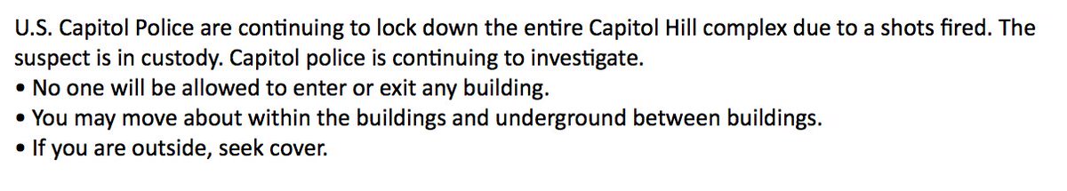 House Sergeant at Arms: Suspect in custody after shots fired at US Capitol. Police continuing to lock down complex.pic.twitter.com/Nm51HUtper