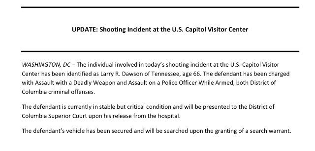“@ABC: Suspect in U.S. Capitol shooting is still in critical condition, hospital says. http://abcn.ws/1PBBDyN pic.twitter.com/7HMn5bxLj8”