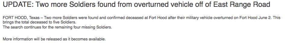 JUST IN: 2 of 6 Fort Hood soldiers missing after truck overturned in creek confirmed dead. http://abcn.ws/1VAAWO2 pic.twitter.com/QoSRFFEWh1