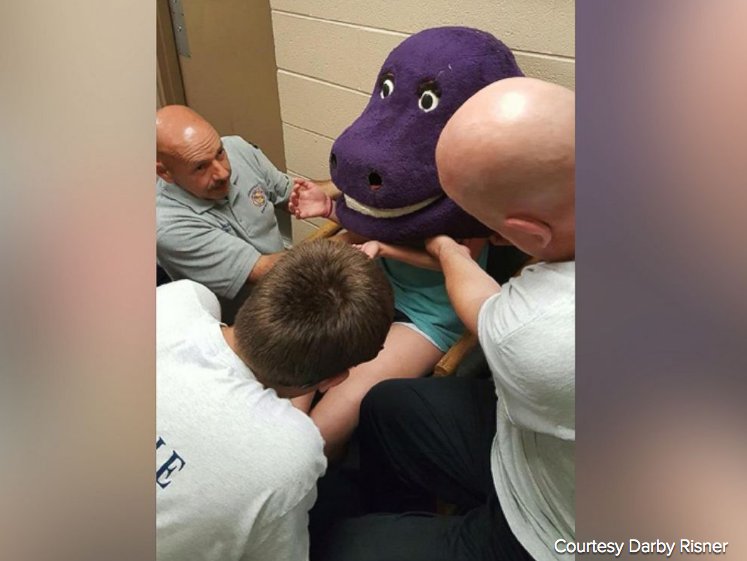 I love you; You love me; Got my head stuck in Barney; With a great big head stuck on my body; Butt of jokes from everybody...