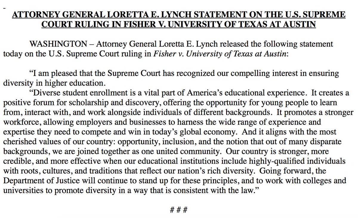 AG Lynch "pleased" that SCOTUS upheld affirmative action program at UT "ensuring diversity in higher education."pic.twitter.com/kWeemhfdKV