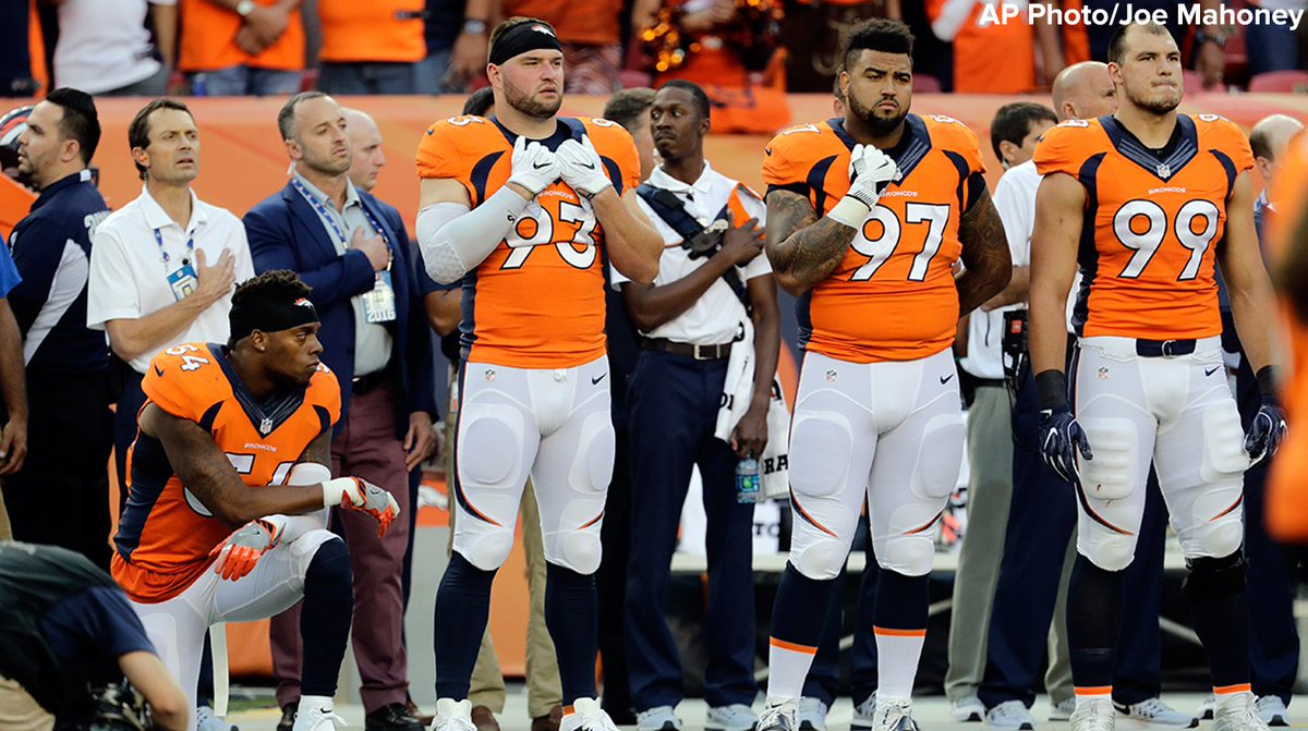 Broncos' Brandon Marshall, a college teammate of Colin Kaepernick, takes knee during anthem. http://abcn.ws/2c3lNa6 pic.twitter.com/3LW2irnNb8